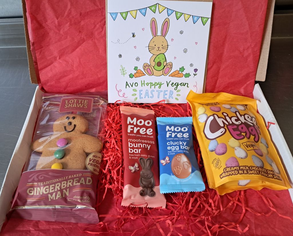 A great selection of Easter treats. Contents shown are: Easter card (we will write your message inside), NOMO chocolate lolly, Chickee Eggs (chocolate with a had sugar shell), Mini Eggs (Chocolate eggs filled with gooey caramel), NOMO Cookie Dough Bunny. All packed in a gift box.